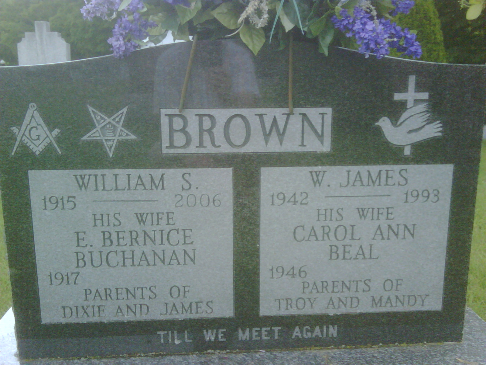 Note from Dan Buchanan: I received a call Tuesday afternoon from Dixie telling me that Aunt Bernice had passed away on Monday. She also asked me to be a pall bearer which I accepted gladly. I took Thursday off and went to Trenton in the afternoon, attending at the Walas Funeral Home in Brighton at 6:00 pm with the family and then for the Eastern Star Service. Visitation commenced at 7 pm and was busy until around 8:30 when we had time to visit. The funeral service on Friday was touching and comforting. Dad provided his normal inspiring and thoughtful message and our work as pall bearers was short, cold and satisfying. Good family visiting followed in the Church Hall and I was able to speak to several persons of interest. Later I went to Dad's in Belleville where we had supper, worked a bit with this new digital camera and digital picture frame and had a good visit. All in all, not a bad few days under the circumstances. Aunt Bernice would have been happy to see the family get together for whatever reason. (Dan Buchanan, Feb 17, 2008.)7 She was buried on 14 February 2008 at Salem Cemetery, Cramahe Twp., Salem, Northumberland Co., Ontario; Memorial: (See Exhibit) BROWN; William S; 1915 - 2006; His Wife; E. Bernice; Buchanan; 1917 - ; Parents of Dixie and James; W. James; 1942 - 1993; His Wife; Carol Ann; Beal; 1946 - ; Parents of; Troy and Mandy (Salem Cemetery, Salem, June 21, 2009.)3