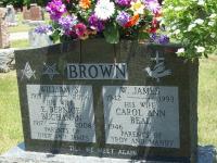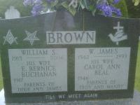 William James "Jim" Brown was born on 27 May 1942 at Cobourg, Northumberland Co., Ontario; Date 1942 per Memorial. Date May 27 1942 per GEDCOM of Troy Brown.1,3,4 He lived on 30 November 1987 at 108 Bayshore Rd., Presqu'ile Point, Northumberland Co., Ontario; Land Registry Records (Grant 137115) show that Warin & Anne R. Lepper granted "All", Lot Twenty, Plan 320, Presqu'ile Point, Northumberland Co. to William James Brown. Reg'n. Date: Nov 30 1987. (Ontario Land Registry Records, Northumberland Co., Northumberland, Book 009, pg. 035 of 135, OnLand.ca.)5 He lived on 4 July 1988 at 108 Bayshore Rd., Presqu'ile Point, Northumberland Co., Ontario; Land Registry Records (Grant 140965) show that William James Brown granted "All", Lot Twenty, Plan 320, Presqu'ile Point, Northumberland Co. to Ann W. Fales. Reg'n. Date: Jul 4 1988. (Ontario Land Registry Records, Northumberland Co., Northumberland, Book 009, pg. 035 of 135, OnLand.ca.)5 He died on 11 October 1993 at Brighton, Northumberland Co., Ontario, at age 51; Date 1993 per Memorial.3,4 He was buried on 13 October 1993 at Salem Cemetery, Cramahe Twp., Salem, Northumberland Co., Ontario; Memorial: (See Exhibit) BROWN; William S; 1915 - 2006; His Wife; E. Bernice; Buchanan; 1917 - ; Parents of Dixie and James; W. James; 1942 - 1993; His Wife; Carol Ann; Beal; 1946 - ; Parents of; Troy and Mandy (Salem Cemetery, Salem, June 21, 2009.)4