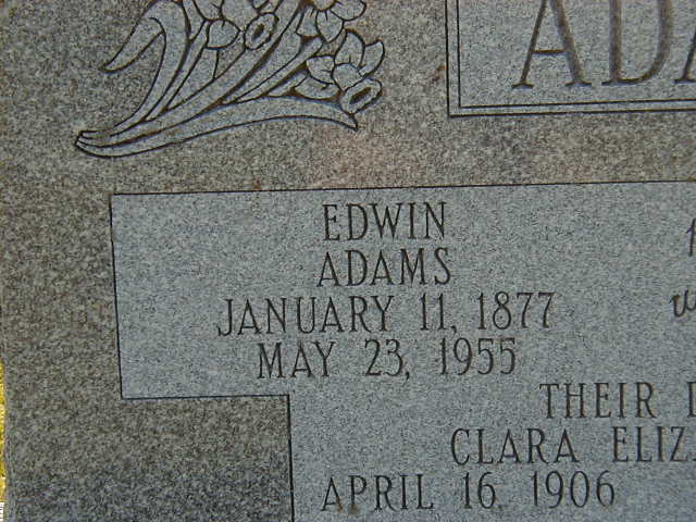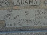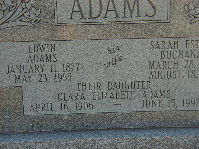 CEMSEarch: Name: Clara Elizabeth Adams; Born: 1906-04-16; Died: 1992-06-15; Notes: Dau of Edwin & Sarah; Buried: Lakeport Cemetery, Haldimand, Conc B, Lot 1; Other names: Edwin Adams (1877-1955), Rex Edwin Adams (1919-1982), Sarah Estalle Adams (Buchanan) (1880-1972.)8