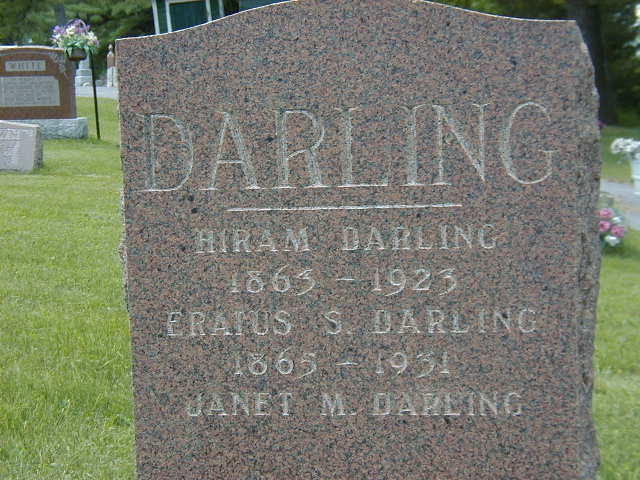 Hiram Darling was born in December 1863 at Percy Twp., Northumberland Co., Canada West; Date 1863 per Memorial. Date 1863 & location Ont. per 1916 Census. Date Dec 1863 & location Ont. per 1911 Census. Date 1864 & location Ont. per 1906 Census. Date 1864 & location Ont. per 1891 Census. Date 1864 & location Ont. per 1881 Census. Date 1864 & location Ont. per 1871 Census. Date 1863 & location Percy per marr. reg'n.1,2,3,4,5,6,7,8 He appeared on the census of 1871 at Percy Twp., Ontario; Age 7 at 1871 Census: see John Darling.9 He appeared on the census of April 1881 at Percy Twp., Ontario; Age 17 at 1881 Census: see John Darling.10 He married Laura Jane Harrison, daughter of William Harrison and Catherine ?, on 26 December 1887 at Huntingdon Twp., Hastings Co., Ontario; Marriage Reg'n.#004626: Groom: Hiram Darling; Age: 24; Res.: Hastings Village; Born: Percy Twp; Status: bachelor; Occ.: School Teacher; Parents: JOhn & Catherine Darling; Bride: Laura Jane Harrison; Res.: Hungerford Twp; Born: Huntingdon Twp; Status: spinster; Parents: William & Catherine Harrison; Wit.: John & Elizabeth Mullett, Huntingdon; Date: Dec 26 1887; Place: Huntingdon; Rel.: Meth; Performed by: Rev. Geo Robinson; Reg'r.: J. G. Foster, Huntingdon (Ontario Marriafge Registration, #004626-1887, ancestry.com.)11 Hiram Darling lived on 19 January 1891 at Toronto University, Toronto, York Co., Ontario; Residence Toronto University, student, per Birth Reg'n. of daughter Grace Lillian Darling.12 He appeared on the census of April 1891 at Brighton Twp., Ontario; Age 27 at 1891 Census: see John Darling.13 He appeared on the census of 1906 at Edmonton, Alberta; Age 42 at 1906 Census: Darling, Hiram, 42, b. Ont., married; Laura, 42, b. Ont., married; Grace, 15, b. Ont., daughter; Earl C., 13, b. USA, son; Elizabeth, 3, b. USA, daughter (1906 Census: Edmonton, Alberta, sub-dist. 27D, pg. 10 of 28, line 37 (left side page, near bottom - no other info in pages) - ancestry.com.)6 He lived in 1910 at Edmonton, Alberta; Location of Birth of Earl & Elizabeth is USA; both show immigration 1910 per 1911 Census.7 He appeared on the census of 1911 at 764 5th, Edmonton, Alberta; Age 47 at 1911 Census: Darling, Hiram, 47, b. Ont. Dec 1863, Scot., Pres., Dentist, married; Laura J., 48, b. Ont. Nov 1862, Irish, Pres., married; Grace L.?, 20, b. Ont. Jan 1891, daughter, Scot., Pres., single; Earl C., 18, b. USA Feb 1893, immig. 1910, son, Scot., Pres., Book Keeper, single; Eliz. H., 7, b. USA Oct 1903, immig. 1910, daughter; Erastus, 40, b. Ont. FEb 1871, Scot., Pres., Medical, lodger, single (1911 Census: Edmonton, Alberta, dist. 2, sub-dist. 72, pg. 17, line 31 - 764 5th - ancestry.com.)7 He appeared on the census of 15 June 1916 at 11658 102 Ave, Edmonton, Alberta; Age 52 at 1916 Census: Darling, Hiram, 52, b. Ont. Scot., Pres., Doctor, married; Laura, 52, b. Ont., Irish, Pres., married; Grace, 25, b. Ont., Scot., Pres., daughter, single; Clare(m), 23, b. USA, Scot., Pres., Student at Sarcee, single (1916 Census: Edmonton, Alberta, dist. 37, sub-dist. 2-4, pg. 31, line 48 - 11658 102 Ave, Edmonton (except for Clare at Sarcee?) - ancestry.com.)8 He was buried in 1923 at Warkworth Cemetery, Warkworth, Northumberland Co., Ontario; Memorial: (See Exhibit) DARLING; Hiram Darling; 1863 - 1923; Erastus S. Darling; 1865 - 1931; Janet M. Darling; -- (Warkworth Cemetery, Warkworth) On a footstone: Hiram Darling 1863-1923.1 He died in 1923 at Edmonton, Alberta; Date 1923 per Memorial. Date 1923 & location Edmonton per family tree of Jac122086 on ancestry.com, Jul 20 2014.14