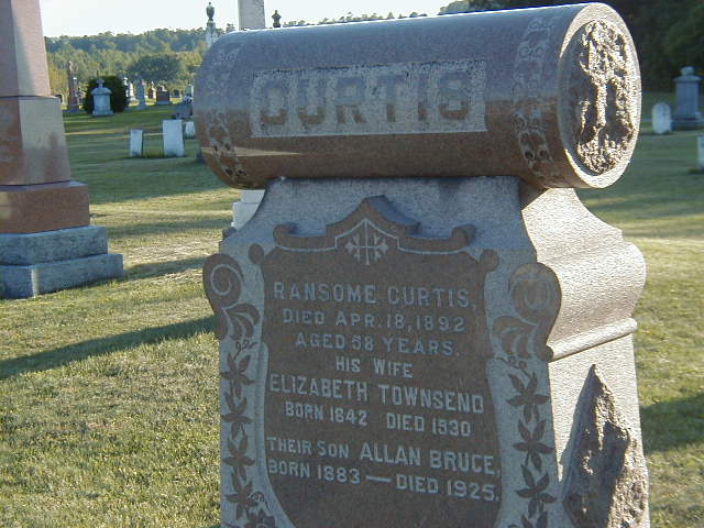 Note: It appeas by this that Robert Rose has either died of moved away and the holder of the mortgage for this land was able to sell it. We see that the two Rose children are not with their parents in the 1881 Census but are living with Eliza Babcock in Cramahe Twp.3 He lived on 6 February 1884 at Conc 8 Lot 3, Brighton Twp., Codrington, Lot 8, Northumberland Co., Ontario; Land Registry Records (Grant M3730) show that Ransome Curtis & wife sold 1/2 acre in Village Lot 8, Block B to James Tate for $1,250. ITS Date Feb 6 1884.3 He died on 18 April 1892 at Percy Twp., Northumberland Co., Ontario. He was buried on 20 April 1892 at Warkworth Cemetery, Warkworth, Northumberland Co., Ontario; Memorial: (See Exhibit) Curtis; Ransome Curtis; Died Apr 18 1892; Aged 58 Years; His Wife; Elizabeth Townsend; Born 1832 died 1930; Their Son Allan Bruce; Born 1883 - Died 1925.4