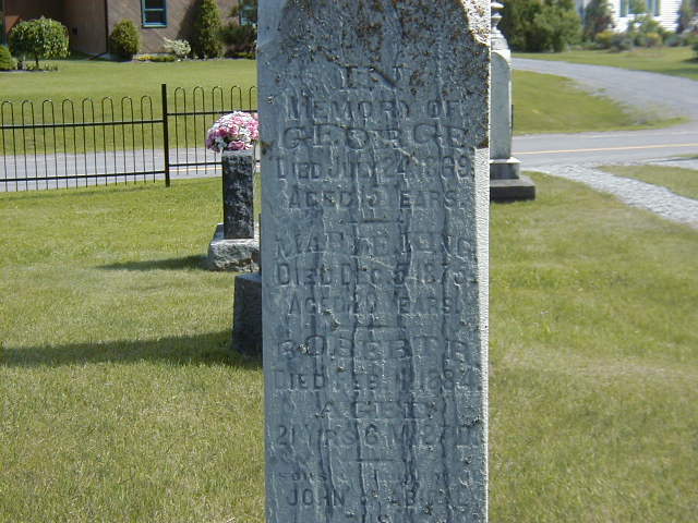 George Bush was born in 1854 at Cramahe Twp., Northumberland Co., Canada West; Date 1854 per Memorial. Date 1853 per CemSearch. Note: 1854 is right - clearly shows age 15.1,2 He died on 24 July 1869 at Cramahe Twp., Northumberland Co., Ontario; Date Jul 24 1869 per Memorial.1 He was buried on 27 July 1869 at Castleton Cemetery, Castleton, Northumberland Co., Ontario; Memorial: (See Exhibit) In; Memory of; Geroge; Died July 24, 1869; Aged 15 Years; Mary E. King; Died Dec 5, 1876; Aged 20 Years; Robert R; Died Feb. 1, 1884; Aged; 21 Yrs 6 M 27 D; Sons & Daughter of; John & Abigail Bush (Castleton Cemetery, Castleton)