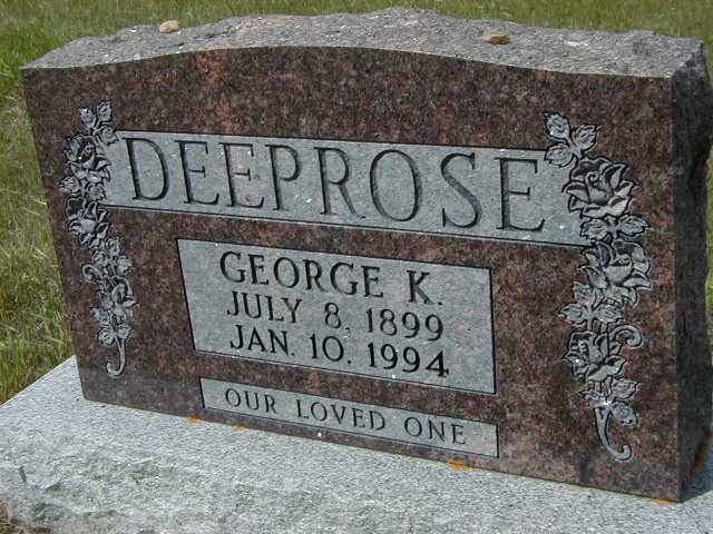 George King Deeprose was born on 8 July 1899 at Murray Twp., Stockdale, Northumberland Co., Ontario; Birth Reg'n.#027888: Name: George King Deeprose; Date: July 8 1899; Father: George Deeprose, Mother: Ethel Mable King; Residence: Stockdale, Occupation: gardiner; Dr: J.N. Simmons, M.D; Informant: George Deeprose, Aug 4, 1899.1 He The name Duprose in Ontario became Deeprose in Alberta - 1902. in 1902 at Morrin, Starland Co., Alberta. He died on 10 January 1994 at Alberta at age 94; Date Jan 10 1994 per Burial.2 He was buried on 13 January 1994 at Morrin Cemetery, Morrin, Starland Co., Alberta; Memorial: (See Exhibit) DEEPROSE; George K; Julu 8, 1899; Jan 10, 1994 (Morrin Cemetery, Morrin, Starland Co., Alberta, July 9, 2005.)2