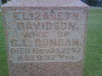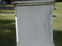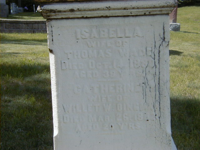 Isabella Dingwall was born in 1843 at Cramahe Twp., Northumberland Co., Canada West; Date 1841 per Memorial. Date 1843 & location Ont. per 1871 Census. Date 1841 & location Cda. per 1851 Census. Date 1841 & location Colborne Township? per marriage register.1,2,3,4 She appeared on the census of 1851 at Cramahe Twp., Northumberland Co., Canada West; Age 10 at 1851 Census: see David Dingwall.5 She lived on 22 September 1860 at Cramahe Twp., Northumberland Co., Canada West; Residence Cramahe Twp. per marriage register.4 As of 22 September 1860,her married name was Wade.6 She married Thomas Wade, son of Abraham Wade and Margaret McCullough, on 22 September 1860 at Cramahe Twp., Northumberland Co., Canada West; Marriage Register: Groom: Thomas Wade; Age: 24; Res.: Cramahe Twp; Born: Haldimand Twp; Parents: Abraham & Margaret Wade; Bride: Isabella Dingwell; Age: 19; Res.: Cramahe Twp; Born: Colborne; Parents: David & Eliza Dingwell; Date: Sep 22 1860; Place: Northumberland & Durham Co. (Ontario Marriage Registers, ancestry.com) per 1871 Census. per email from Lori Hood, Feb 22 2007.6,3,4 Isabella Dingwall appeared on the census of April 1871 at Cramahe Twp., Northumberland Co., Ontario; Age 28 at 1871 Census: see Thomas Wade.3 She died on 14 October 1880 at Ontario; Date Oct 14 1880 per Memorial.2 She was buried on 16 October 1880 at Castleton Cemetery, Cramahe Twp., Castleton, Northumberland Co., Ontario; Memorial: (See Exhibit) Isabella; Wife of; Thomas Wade; Died Oct. 14, 1880; Aged 39 Years; Catherine; Wife of Willet W. Dingman; Died Mar. 26, 1883?; Aged 29? Years (Castelton Cemetery, June 5 2009.)2