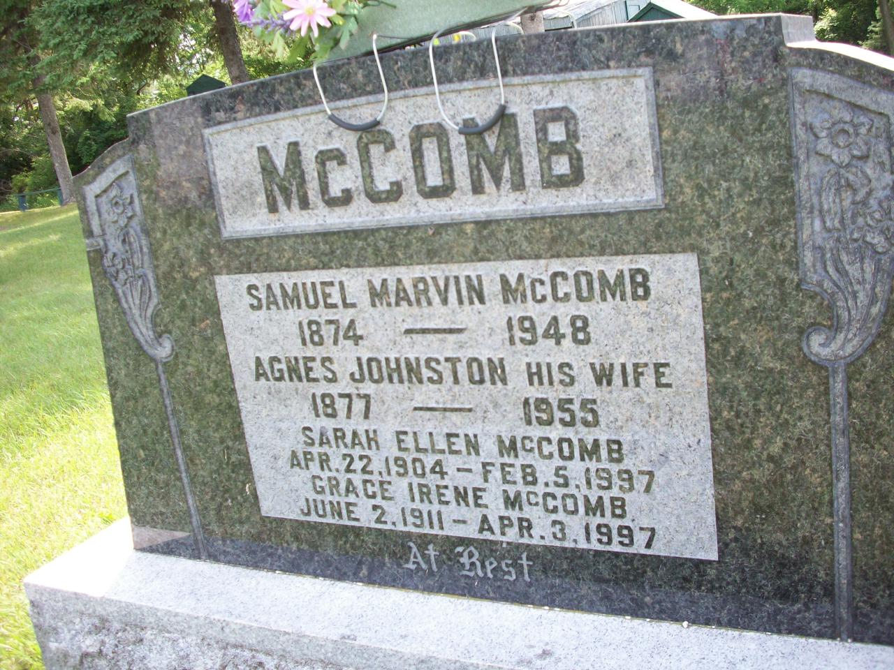 Samuel Marvin McComb was born on 2 May 1874 at Wisconsin, U.S.A; Date 1874 per Memorial. Date 1874 & location USA per 1931 Census. Date May 2 1873 & location USA per 1901 Census. Date 1875 & location Ont. per 1891 Census. Date 1875 & location Ont. per 1881 Census. Date 1874 & location Ont. per marr. reg'n.1,2,3,4,5,6 He immigrated in 1877 to Ontario; Immigration 1877 per 1901 Census.1 He appeared on the census of April 1881 at Cardiff Twp., Peterborough Co., Ontario; Age 6 at 1881 Census: see William J. McComb.3 He appeared on the census of April 1891 at Rawdon Twp., Hastings Co., Ontario; Age 16 at 1891 Census: see Sarah McComb (mother.)4 He lived on 14 August 1895 at Rawdon Twp., Hastings Co., Ontario; Witness at marriage of John Henry Booth & Hattie Arwilda McComb.2 He lived on 28 February 1900 at Rawdon Twp., Hastings Co., Ontario; Residence Rawdon per marr. reg'n.2 He married Agnes May Johnston, daughter of Hamilton Johnston and Margaret Waddell, on 28 February 1900 at Seymour Twp., Northumberland Co., Ontario; Marriage Reg'n.#011896: Groom: Marvin McComb; Age: 25; Res.: Rawdon; Born: Ontraio; Status: bachelor; Occ.: farmer; Parents: William McComb & Sarah Brown; Bride: Agnes Johnston; Age: 22; Res. & Born: Seymour Twp; Status: spinster; Parents: Hamilton Johnston & Margaret Waddell; Wit.: Marshall McComb, Rawdon Twp. & Jessie Johnston, Seymour Twp; Date: Feb 28 1900; Place: Seymour Twp; Re.: Meth; Performed by: Rev. M. ?Wetherill?; Reg'd.: Mar 1 1900; Reg'd.: J. B. Ferris (Ontario Marriage Registration, #011896-1900, ancestry.com) Location Healy Falls per IGI Record.7,8 Samuel Marvin McComb appeared on the census of April 1901 at Marmora & Lake Twp.'s, Hastings Co., Ontario; Age 27 at 1901 Census: McComb, Marvin, 27, b. US May 2 1873, immig. 1877, Irish, Meth, farmer, married; Agnes, 23, b. Ont. r. Jul 16 1877, Irish, Meth., married; Rodgers, Henry, 12, b. Ont. r. Apr 20 1888, Irish, Meth., lodger (1901 Census Online: Marmora & Lake Twp.'s, dist. 71, sub-dist. j-1, pg. 23, line 42, T-6473 - Conc 3, pt. Lot 9.)1 He appeared on the census of 6 June 1931 at Cramahe Twp., Northumberland Co., Ontario; Age 57 at 1931 Census: McComb, Samuel, 57, b. USA, p.b. Ont., immig. 1877 - NAT, Irish, UC, farmer, married; Agnes, 50, b. Ont., p.b. Ont. & Scotland, UC, married; Lorne H., 25, b. Ont., p.b. USA & Ont., Irish, UC, farm laborer on father's farm, single; James A., 21, b. Ont., p.b. USA & Ont., Irish, UC, farm lab. on father's farm, single; Nettie P., 23, b. Ont., p.b. USA & Ont., Irish, UC, single; Grace C., 20, single; Verona M., 13; Una C., 10 (1931 Census: Cramahe Twp., Northumberland Co., dist. ? Northumberland; Sub-dist. 11, Cramahe Twp., pg. 6, line 17 - ancestry.ca.)6 He died on 17 November 1948 at Conc 8 Lot 22, Cramahe Twp., Northumberland Co., Ontario, at age 74; Date 1948 per Memorial. Date Nov 17 1948 & location Cramahe Twp. per IGI Record.8,5 He was buried on 20 November 1948 at Castleton Cemetery, Castleton, Northumberland Co., Ontario; Memorial: (See Exhibit) McCOMB; Samuel Marvin McComb; 1874 - 1948; Agnes Johnston his wife; 1877 - 1955; Sarah Ellen McComb; Apr. 22, 1904 - Feb. 5, 1997; Grace Irene McComb; June 2, 1911 - Apr. 3, 1997 (Castleton Cemetery, Castleton, Jul 13 2009.)5