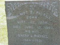 CemSearch: Name: Sarah J. Pickle; Maiden: Maybee; Born: 1844; Died: 1931; ID: MTHOPE214; Other names: Pickle, Clinton C. (1887-1970), Pickle, Dora H. [Fulford] (1891-1919), Pickle, Laura [Ridley] (1891-1961), Pickle Wilmot S. (1854-1903); Cemetery: Mount Hope Cemetery, Conc A, Lot 35, Brighton Twp., Village of Brighton, Northumberland Co., Sec 1 Row 11; Note: Wife of Wilmot S. Pickle. (https://www.cemsearch.ca/burial/?pid=MTHOPE214%5E1)