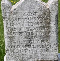 Lucy Clark was born on 7 April 1807 at Canton, Saint Lawrence Co., New York, U.S.A; Date Apr 7 1807 per Memorial - age 84y 4d at death Apr 11 1891. Date 1807 & location New York State per Death Reg'n. - age 84 at death Apr 11 1891. Date 1807 & location US per 1881 Census. Date 1806 & location US per 1871 Census. Date 1806 & location US per 1861 Census. Date 1806 & location US per 1851 Census.1,2,3,4,5,6 She appeared on the census of March 1852 at Brighton Twp., Northumberland Co., Canada West; Age 45 at 1851 Census: see Walter Clark.1 She appeared on the census of April 1861 at Brighton Twp., Northumberland Co., Canada West; Age 35 at 1861 Census: see Walter Riley Clark.7 She appeared on the census of April 1871 at Brighton Twp., Northumberland Co., Ontario; Age 65 at 1871 Census: see Walter Riley Clark (brother) ??? Appears to show W. for widow - not clear??8 She appeared on the census of April 1881 at Brighton Twp., Northumberland Co., Ontario; Age 74 at 1881 Census: see Walter R. Clark.4 She died on 11 April 1891 at Brighton Twp., Northumberland Co., Ontario, at age 84; Death Reg'n.#010862: Name: Lucy Clark; Date: Apr 11 1891; Age: 84y; Born: New York State; Cause: old age; Phys.: none; Inf.: Rev. R.H. Leitch, Hilton; Reg'd.: Apr 14 1891; Rel.: Meth; Reg'r.: A.A. Becker, Brighton Twp. (Ontario Death Registration, #010862-1891, ancestry.ca) per family tree of KristyCrane, Dec 23 2011.9,10 She was buried on 13 April 1891 at Clark's Burying Ground Cemetery, Brighton Twp., Northumberland Co., Ontario; Memorial: (see Exhibit) In; Memory of; A Departed Mother; Died Sept. 28, 1890; Aged 74 Y'rs, 7 M. 20 D; Also; Lucy Clark; Died April 11, 1891; Aged 84 Y'rs ) M. 4 D (Clark's Burying Ground Cemetery, image from KristyCrane family tree on ancestry.ca, Feb 23 2022.)6,9
