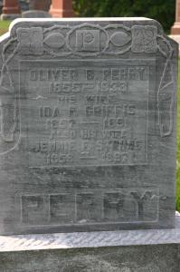 Ida Florence Griffis was born in 1857 at Cramahe Twp., Northumberland Co., Canada West; Date 1857 per Memorial. Date 1857 & location Ont. per 1891 Census. Date 1858 & location Ont. per 1881 Census. Date 1856 & location Cramahe Twp. per marr. reg'n.4,2,5,3 She lived on 23 February 1876 at Trenton, Hastings Co., Ontario; Residence Trenton per marr. reg'n.2 As of 23 February 1876,her married name was Perry. She married Oliver "Byron" Perry, son of Charles P. Perry and Marinda Rogers, on 23 February 1876 at Trenton, Hastings Co., Ontario; Marriage Reg'n.#003962: Groom: Oliver Byron Perry; Age: 20; Res. & Born: Brighton; Status: bachelor; Occ.: yeoman; Parents: Charles & Marinda Perry; Bride: Ida Florence Griffis; Age: 18; Res.: Trenton; Born: Cramahe Twp; Status: spinster; Parents: Andrew & Nancy Griffis; Wit.: George Johnson, Trenton & Allie Perry, Murray Twp; Date: Feb 23 1876; Place: Trenton; Rel.: Pres. & WM; Performed by: Rec. P. E. Howell; Reg'r.: Jerh Simmons, Trenton (Ontario Marriage Registration, #003962-1876, ancestry.com) per GEDCOM of Richard Lander, Aug 14, 2005.1,6 Ida Florence Griffis appeared on the census of April 1881 at Brighton Twp., Northumberland Co., Ontario; Age 23 at 1881 Census: see O. B. Perry.5 She appeared on the census of April 1891 at Brighton Twp., Northumberland Co., Ontario; Age 34 at 1891 Census: see Byron Perry.7 She died on 23 July 1891 at Brighton Twp., Brighton, Northumberland Co., Ontario; Date 1891 per Memorial. Date Jul 23 1891 & location Brighton per GEDCOM of Cheryl Taber Kemp, Oct 14, 2007.1,3 She was buried on 25 July 1891 at Mount Hope Cemetery, Brighton, Northumberland Co., Ontario; Memorial: (See Exhibit) Oliver B. Perry; 1855-1938; His Wife; Ida F. Griffis; 1857-1891; Also His Wife; Jennie F. Strong; 1858-1897; PERRY (Mount Hope Cemetery, Brighton, Susan Brose Photo 369, Oct 2012.)3