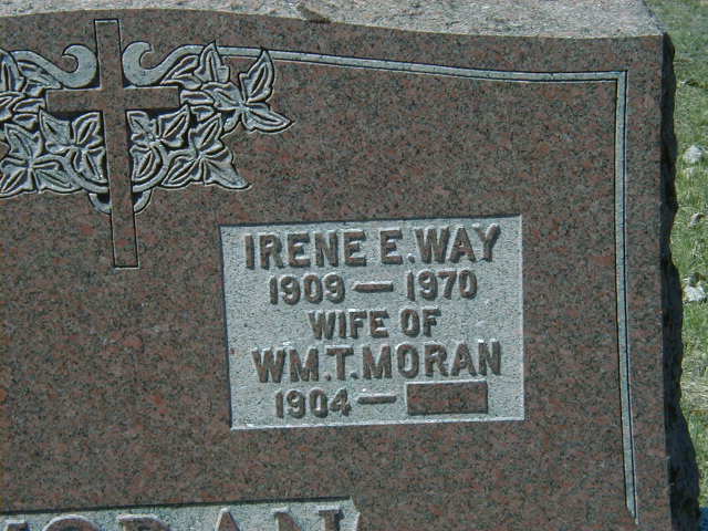 Note: Is this the same Irene Elizabeth Way who we have married to Gerald Sompson - daughter of Horace Way who had the cheese factory north of Hilton????1,6 William Thomas "Bill" Moran lived on 15 October 1978 at R. R. 1, Codrington, Northumberland Co., Ontario; "Beloved brother of William T. Moran, RR1, Codrington .. " per the Death Notice of Gerald Phiilp Moran from The Tweedsmuir Histories of Codrington, copied from microfilm at The Metro Toronto Reference Library, Nov. 2007.1 He died on 18 December 1997 at Hillsdale Manor, Oshawa, Ontario, at age 93; "William Thomas Moran; At the Hillsdale Manor, Oshawa on Thursday, December 18, 1997 aged 93 years. Born in Codrington, Ontario, he is the son of the late Thomas Moran and the late Sarah Houlihan. Beloved husband of the late Irene Elizabeth (Way). Dear father of Mary Anne Murphy of Oshawa and Sarah Cotton of Springhill, Nova Scotia. Predeceased by brothers Vincent and Gerald and sisters Fracnes and Mary. Sadly missed by grandhildren John, Tom, Roger and Elton and great-grandchildren Amanda, Amy, Kneisha and Lucas. Bill had lived and farmed all of his life in the Codrington area. Bill was a member of St. Alphonsus Church in Wooler. Funeral mass was held .. Monday, December 22nd .. Interment Codrington Cemetery." per the Death Notice of William Thomas Moran, from The Tweedsmuir Histories of Codrington, copied from microfilm at The Metro Toronto Reference Library, Nov. 2007.1 He was buried on 21 December 1997 at Roman Catholic Cemetery, Brighton Twp., Codrington, Northumberland Co., Ontario; Memorial: (See Exhibit) Irene E. Way; 1909 - 1970; Wife of; Wm. T. Moran; 1904 - (Roman Catholic Cemetery, Codrington, Oct 29 2010.)7