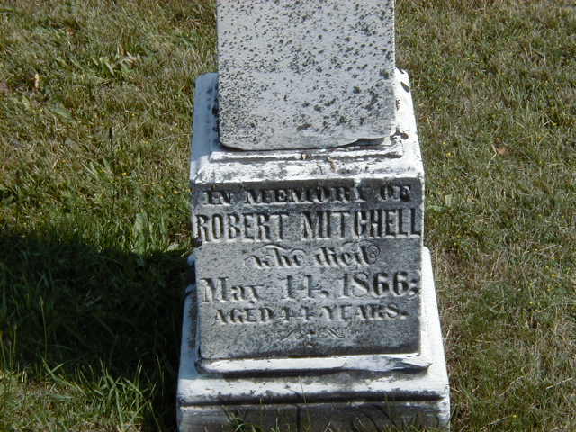 CemSearch: Name: Robert Mitchell; Born: 1822; Died: May 14 1866; Age: 44y; ID: STONES130; Other names: Mitchell, John Albert (1858-1869); Cemetery: Stone's Cemetery, Conc 1, Lot 15, Percy Twp., Northumberland Co; Note: Married Agnes Best on Jan. 9, 1854 at Cavan. Father of Margaret (Jackson) Johnston, Eliza (Peter) Inglis, James henry (Mary Emma "Minnie" Ames), Ella and John. From Allan Birney and Dan Buchanan.. (https://www.cemsearch.ca/burial/?pid=STONES130%5E0.)3,6