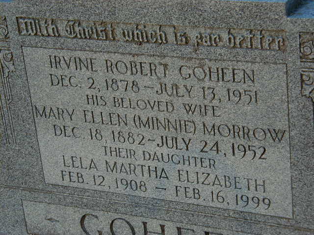CEMSearch: Name: Irvine Robert Goheen; Born: 1878-12-02; Died: 1951-07-13; Notes: H/O Mary Ellen Morrow; Buried: Salem Cemetery, Cramahe Twp; Other names: Lela Martha Elizabeth Goheen (1908-1999), Mary ellen (Minnie) Goheen (Morrow) (1882-1952)
