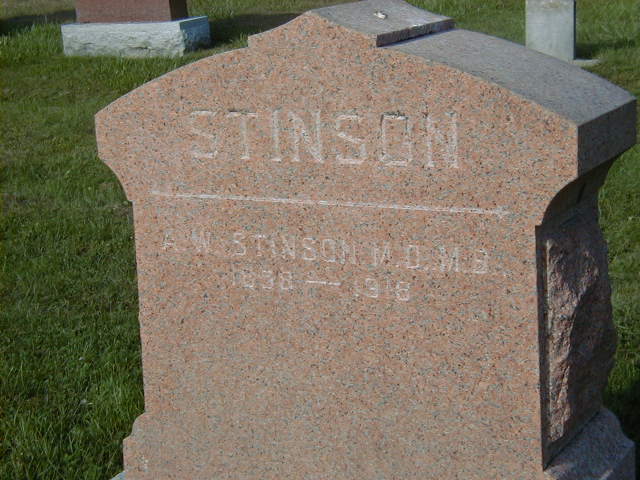 Note: This should probably say 72 and 73 Prince Edward St. West. See land record.1 He lived on 4 July 1904 at Village Lot 11, Prince Edward St. West (74), Brighton, Northumberland Co., Ontario; Land Registry Records (Grant 3671) show that Albert W. Stinson sold "Lots 11 and 12", Village Lot 11, Prince Edward St. West, Brighton Village, Northumberland Co. to Minnie Maud Stinson $2,000. ITS Date: Feb 15 1901. Reg'n. Date: Jul 4 1904. (Ontario Land Registry Records, Northumberland Co., Brighton Village, Book 006, Pg 242 of 282, page copied from OnLand.ca by Dan Buchanan, Feb 8 2022.)8 He lived on 25 November 1907 at Village Lot 11, Prince Edward St. West (74), Brighton, Northumberland Co., Ontario; Land Registry Records (Mortgage 4119) show that Albert W. Stinson was the Grantor of a mortgage "said lot with other land subject to mortgages", Village Lot 11, Prince Edward St. West, Brighton Village, Northumberland Co. and Grantee was William Usher in the amount of $600. ITS Date: Nov 25 1907. Reg'n. Date: Nov 30 1907. (Ontario Land Registry Records, Northumberland Co., Brighton Village, Book 006, Pg 242 of 282, page copied from OnLand.ca by Dan Buchanan, Feb 8 2022.)8 He lived on 8 September 1908 at Village Lot 11, Prince Edward St. West (74), Brighton, Northumberland Co., Ontario; Land Registry Records (Grant 4219) show that Albert W. & Minnie M. Stinson sold "said lot with other land subject to mortgages which grantee assumes (but does not sign)", Village Lot 11, Prince Edward St. West, Brighton Village, Northumberland Co. to Howard C. Rundle for $3,625. ITS Date: Sep 8 1908. Reg'n. Date: Sep 10 1908. (Ontario Land Registry Records, Northumberland Co., Brighton Village, Book 006, Pg 242 of 282, page copied from OnLand.ca by Dan Buchanan, Feb 8 2022.)8 He appeared on the census of 1911 at Cobourg, Northumberland Co., Ontario; Age 53 at 1911 Census: Stinson, Albert W., 53, b. Ont. July 1858, Eng., CE, married; Minnie, 44, b. Ont. Jul 1867, Eng., Meth., married; Orser, Philander S., 87, b. Ont. May 1824, Eng., Meth., widower (1911 Census Online: Cobourg, dist. 102, sub-dist. 4, pg. 1, line 29.)5 He died on 29 October 1918 at Cobourg, Northumberland Co., Ontario, at age 60; Death Reg'n.#028853: Name: Albert Washington Stinson; Date: Oct 29 1918; Age: 60 yrs; Born: Bloomfield; Burial: Brighton; Cause: influenza; Occ.: Physician; Status: married; Parents: John Smith Stinson & Pheobe Bedell; Cause: pneumonia; Phys.: Dr. Field; Inf.: Mrs. Stinson, Cobourg; Reg'r.: Oct 30 1918 (Ontarion Death Registration, #028853-1918, ancestry.com.)9 He was buried on 2 November 1918 at Brighton, Northumberland Co., Ontario; Memorial: (See Exhibit) STINSON; A. W. Stinson M.D, M. B; 1858 - 1918 (Mount Hope Cemetery, Brighton - on rear of Philander Orser Memorial) Location Brighton per Death Reg'n.2,10