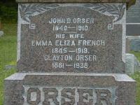 John Bedford Orser was born on 13 April 1841 at Hallowell Twp., Prince Edward Co., Ontario; Date 1841 per Memorial. Date per Hubbsgen@aol.com, email May 20, 2001. Date per 1851 Census. Is under Jesse & Ann - is he their son?1 He appeared on the census of April 1851 at Hallowll Twp., Prince Edward Co., Ontario; Age 11 at 1851 Census: see Jesse Orser.2 He married Emma Eliza French before 1863. John Bedford Orser died on 14 September 1910 at Picton, Prince Edward Co., Ontario, at age 69; Date 1910 per Memorial. Date per Hubbsgen@aol.com, email May 20, 2001.1 He was buried on 16 September 1910 at Glenwood Cemetery, Picton, Prince Edward Co., Ontario; Memorial: (see Exhibit) John B. Orser; 1840-1910; His Wife; Emma Eliza French; 1845-1919; Clayton Orser; 1881-1938 (Glenwood Cemetery, Picton) Per Hubbsgen@aol.com, email May 20, 2001.1
