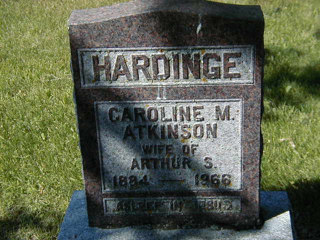 Caroline M. "Carrie" Atkinson was born on 10 May 1884 at Percy Twp., Northumberland Co., Ontario; Date 1884 per Memorial. Date 1884 & location Ont. per 1911 Census. Date May 10 1884 & location Ont. rural per 1901 Census. Date 1884 per marr. reg'n.4,2,3,5 She appeared on the census of April 1891 at Percy Twp., Northumberland Co., Ontario; Age 6 at 1891 Census: see Thomas J. Atkinson.6 She appeared on the census of April 1901 at Percy Twp., Northumberland Co., Ontario; Age 16 at 1901 Census: see Thomas J. Atkinson.7 She lived on 21 December 1910 at Percy Twp., Dartford, Northumberland Co., Ontario; Residence Dartford per marr. reg'n.3 As of 21 December 1910,her married name was Hardinge.1 She married Arthur Stillman Hardinge, son of Frederick Yorke Hardinge and Susan Elizabeth Kingsley, on 21 December 1910 at Percy Twp., Dartford, Northumberland Co., Ontario; Marriage Reg'n.#017025: Groom: Arthur Stillman Hardinge; Age: 23; Res.: Cramahe Twp; Status: married; Occ.: farmer; Rel.: Meth; Parents: Frederick Hardinge, farmer & Susan Kingsley; Bride: Carrie M. Atkinson; Age: 26; Res.: Dartford; Status: spinster; Rel.: Meth; Parents: Thomas J. Atkinson, farmer & Ellen Macklin; Wit.: M. Frankln Hawkins, Woodrow, Ont. & Dorcas Atkinson, Dartford; Date: Dec 21 1910; Place: Dartford, Ont; Performed by: Rev. W. D. Harrison, Warkworth; Reg'd.: Dec 22 1910; Reg'r.: P. S. Ewing, Percy Twp. (Ontario Marriage Registration, #017025-1910, ancestry.com) per GEDCOM of Erika Howard, Feb 27, 2005.1,8 Caroline M. "Carrie" Atkinson appeared on the census of 1911 at Cramahe Twp., Northumberland Co., Ontario; Age 27 at 1911 Census: see Arthur S. Hardinge.5 She died in 1966 at Ontario; Date 1966 per Memorial.2 She was buried in 1966 at Stone's Cemetery, Percy Twp., Northumberland Co., Ontario; Memorial: (See Exhibit) HARDINGE; Caroline M; Atkinson; Wife of; Arthur S; 1884 - 1966 (Stone's Cemetery, Percy Twp., Jun 25 2007.)2