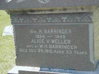 William H. Barringer was born in 1855 at Cramahe Twp., Northumberland Co., Canada West; Date 1854 per Memorial. Date Sep 15 1860 & location England per 1901 Census. Date 1855 & location Ont. per 1871 Census. Date 1855 & location Cramahe Twp. per marriage reg'n. - 2nd, Lucy Weatherson (assuming these details were just wrong.)1,2,3,4,5 He appeared on the census of April 1861 at Cramahe Twp., Northumberland Co., Canada West; Age 7 at 1861 Census: see Jacob Barringer.4 He appeared on the census of April 1871 at Cramahe Twp., Northumberland Co., Ontario; Age 16 at 1871 Census: see Jacob Barringer.3 He married Alice V. Weller, daughter of Samuel Robert Weller and Sarah Ann Vansicklen, before 1883 at Northumberland Co., Ontario. William H. Barringer lived on 28 February 1883 at Cramahe Twp., Northumberland Co., Ontario; Informant for Death Reg'n. of his father Jacob Barringer.6 He appeared on the census of April 1901 at Cramahe Twp., Northumberland Co., Ontario; Age 41 at 1901 Census: Barringer, William H., 41, b. Ont. r. Sep 15 1860, Ger., Meth., farmer, married; Alice V., 41, b. Ont. r. Feb 15 1860, Eng., Meth., married; Cora A., 16, b. Ont. r. Jun 27 1884, Ger., daughter; Delia J., 44, b. Dec 30 1854, sister, single; Ducie, George, 14, b. Eng. Dec 14 1886, Eng., immig. adopted (1901 Census Online: Cramahe Twp., dist. 95, sub-dist. e-4, pg. 11, line 13, T-6485 - Conc 9, Lot 23 & 21.)1 He lived in April 1901 at Conc 9 Lot 23, Cramahe Twp., Northumberland Co., Ontario; Residence per 1901 Census: Conc 9, Lot 23 & 21, Cramahe Twp.1 He lived on 19 December 1913 at Percy Twp., Warkworth, Northumberland Co., Ontario; Informant for Death Reg'n. of his mother Alice V. (Weller) Barringer.6 He married Lucy Weatherson, daughter of Luke Weatherson and Mary Miller, on 3 February 1915 at Percy Twp., Warkworth, Northumberland Co., Ontario; Marriage Reg'n.#010548: Groom: William H. Barringer; Age: 60; Res.: Warkworth; Born: Cramahe Twp; Status: widower; Occ.: Retired Gentleman; Rel.: Meth; Parents: Jacob Barringer & Liza Ann Darling; Bride: Lucy Weatherson; Age: 40; Res. & Born: Warkworth; Status: spinster; Rel.: Pres; Parents: Luke Weatherson & Mary Miller; Wit.: Mr. & Mrs. F. H. Howard, Warkworth; Date: Feb 3 1915; Place: Warkworth; Performed by: W. D. McDonald, Warkworth, Pres; Sworn: Warkworth, Feb 5 1915 (Ontario Marriage Registration, #010548-1915, ancestry.com.)7 William H. Barringer was buried in 1945 at Warkworth Cemetery, Warkworth, Northumberland Co., Ontario; Memorial: (See Exhibit) Wm. H. Barringer; 1854 - 1945; Alice V. Weller; Wife of Wm. H. Barringer; Died Dec 29, 1913, Aged 53 Years (Warkworth Cemetery, Warkworth, Apr. 28, 2007.)5 He died in 1945 at Ontario; Date 1945 per Memorial.5
