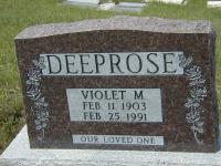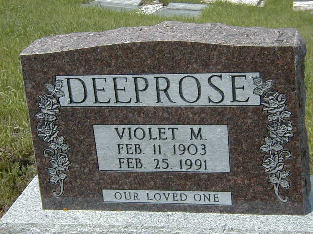 Violet Mary Deeprose was born on 11 February 1903 at Morrin, Starland Co., Alberta; "Unmarried, lives at home - taught school (teaching in 1965) - retired by 1970. Violet - a fine Christian." per Mildred (King) Beitzel's family history. She was retired in 1970 at BOX 173, T0J 2B0, Morrin, Alberta; Per Mildred (King) Beitzel's family tree. She Ron Deeprose says " ... Aunt Violet didn't marry. " after 1970 at Alberta. She died on 25 February 1991 at Drumheller, Alberta, at age 88; Date Feb 25 1991 per Memorial. Location Drumheller per family tree of 3ring01 on ancestry.com, Jul 20 2014.1,2 She was buried on 28 February 1991 at Morrin Cemetrey, Morrin, Staland Co., Alberta; Memorial: (See Exhibit) DEEPROSE; Violet M; Feb. 11, 1903; Feb. 25, 1991 (Morrin Cemetery, Morrin, Starland Co., Alberta, July 9, 2005.)1