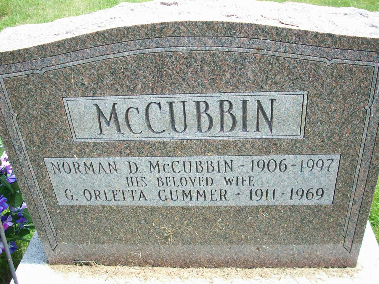 Georgina Orletta Gummer was born on 26 June 1911 at Percy Twp., Norham, Northumberland Co., Ontario; Birth Reg'n.#036120: Name: Georgina Orletta Gummer; Date: Jun 26 1911; Place: Conc 2, Lot 18, Percy Twp; Parents: Norman William John Gummer, farmer & Pearl Victoria Peat; Married: Jan 6 1909, Plainville, Ont; Phys.: C. C. Amrstrong; Inf.: N. W. J. Gummer, father, Norham; Reg'.d.: Aug 19 1911; Reg'r.: P. S. Ewing, Percy Twp. (Ontario Birth Registration, #036120-1911, ancestry.ca) James A. McKane GEDCOM.3,4 She appeared on the census of 14 June 1921 at Percy Twp., Northumberland Co., Ontario; Age 10 at 1921 Census: see Norman Gummer.2 She lived in 1940 at Percy Twp., Norham, Northumberland Co., Ontario; "102 Gummer, Norman, farmer, Norham" & "103 Gummer, Mrs. Norman, Norham" & "104 Gummer, Miss Orletta, spinster, Norham" & "105 Gummer, Kenneth, farmer, Norham" per Canada Voter Lists, 1940, Northumberland Co., Percy Twp., pg. 95 of 118, ancestry.ca.5 As of after 1942,her married name was McCubbin. She married Norman D. McCubbin, son of John McCubbin and Mary Ann Campbell, after 1942.5 Georgina Orletta Gummer was buried in 1969 at Warkworth Cemetery, Warkworth, Northumberland Co., Ontario; Memorial: (See Exhibit) McCubbin; Norman D. McCubbin - 1906 - 1997; His Belovd Wife; G. Orletta Gummer - 1911 - 1969 (Warkworth Cemetery, Warkworth, July 12 2009.)6 She died in 1969 at Ontario; Date 1969 per Memorial.6