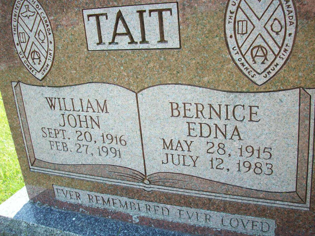 FindaGrave: Name: Bernice Edna Clark Tait; BIRTH: 28 May 1915, Codrington, Northumberland County, Ontario, Canada; DEATH: 12 Jul 1983 (aged 68), Peterborough, Peterborough County, Ontario, Canada; BURIAL: Castleton Cemetery, Castleton, Northumberland County, Ontario, Canada; PLOT: Section: D-N, Row-8, Plot: 16; MEMORIAL ID: 198935193 (https://www.findagrave.com/memorial/198935193/bernice-edna-tait.)1,3