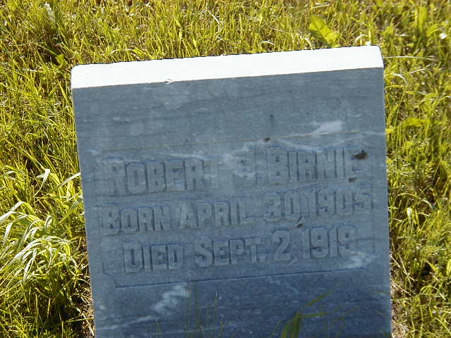 Robert Birnie was born on 30 April 1905 at Birnie, Manitoba; Date Apr 30 1905 per Burial.1 He died on 2 September 1919 at Birnie, Manitoba, at age 14; Date Sep 2 1919 per Burial. " ... A son, robert was killed in a farm accident Sept. 2, 1919 ... " article re James Birnie family in East of the Mountains, pg 129.1 He was buried on 4 September 1919 at Birnie Cemetery, Birnie, Manitoba; Mmeorial: (See Exhibiti) Robert J. Birnie; Bonr April 30, 1905; Died Sep 2, 1919 (Birnhie Cemetery, Birnie, Manitoba, July 14, 2005.)1