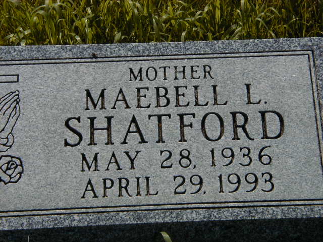 "In Loving Memory of; MAEBELL LILLIAN SHATFORD; Age 56 years; Born; May 28, 1936; RM of Rosedale, Manitoba; Died; April 29, 1993; Neepawa, Manitoba; Funeral Service; Tuesday, May 4, 1993; 2:00 PM; Riding Mountain Legion Hall; Riding Mountain, Manitoba; Officiating; Rev. Sarah Reaburn; Final Resting Place; Birnie Cemetery... Pallbearers; Ron Birch, Bill carruthers, Jim Ames, Larry Henton, Jim Birnie, Joe Sawchuck; Organist: Merle Spafford; Dobchuk Funeral Home, McCreary" ... (written in) ... " Maebelle had a breast removed about a year ago (cancer); she had another operation about a month ago (cancer)" from funeral service hand-out, copy provided by Alma Draper, April 2001.1