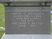 Age 25 at 1871 Census: Bullock, David C., 25, b. Ontario, C. of E., English, Grocer, married Sept; Theresa, 23, b. Ontario, C. of E., Irish, married Sept. He appeared on the census of April 1881 at Brighton, Northumberland Co., Ontario; Age 37 at 1881 Census: Bullock, David C., 37, b. Ontario, C. E., English, merchant, married; Adelaide, 37, b. Ontario, C. E, English, married; Clarence, 9; Arthur, 7; Hellena, 4.4 He "Grandson David was initiated into the Lodge in 1883. He was appointed secretary, then Worshipful Master in 1891." from United Lodge No. 29 A.F. & A.M., G.R.C., Brighton, Ontario History 1818-1996 written by W. R. Topham, page 3 in 1883 at United Lodge No. 29, Brighton, Northumberland Co., Ontario. He "Col. Richard Bullock - First Master of United Lodge No. 29: A unique condition exists in United Lodge No. 29 A.F. and A.M. this year. The Master Elect, Hubert Bullock, 30 years of age, is the fifth of that name in direct decent to sit as Master. His great-great-grandfather, Col. Richard Bullock, was Master from 1818 to 1821; Christopher Bullock, his son, was Master about the year 1845; the latter's son, D. C. Bullock, in 1891; ? A. D. Bullock, 1909 and 1910; and now his son H. A. Bullock in 1930. The lodge has photographs of all five." on the front page, top left of The Brighton Ensign, Jan. 30, 1930, see on microfilm at The Ontario Archives, Feb. 22, 2001 in 1891 at Brighton, Northumberland Co., Ontario.10 He appeared on the census of April 1891 at Brighton, Northumberland Co., Ontario; Age 47 at 1891 Census: Bullock, D. C., 47, b. Ontario, parents b. Qubec & U.S., C. e., grocer, married; Adelaide, 46, b. Ontario, parents b. U.S., C E., married; Clarence C., 19, b. Ontario, parents b. Ontario, C. E., grocery clerk; David A., 17; Helena, 14; Agnes, 10.3 He lived in 1896 at Brighton, Northumberland Co., Ontario; "Bullock, D.C., grocer" Canada, City and Area Directories, 1896, Northumberland Co, Brighton Village, pg. 153 of 229, ancestry.ca.11 He lived on 11 March 1896 at Lot 5, Water St. South, Presqu'ile Point, Northumberland Co., Ontario; Land Registry Records (Grant 3474) show that Luman Taylor & wife sold "1 acre, lot 5, also 2 acres adjoining on the south side and enclosed with same", Lot 5, Water Street South, Presqu'ile Point, Northumberland Co., to David C. Bullock for $400. ITS Date: Mar 11 1896. Reg'n. Date: Mar 13 1896. (Ontario Land Registry Records, Northumberland Co., Brighton Twp., Book 013, pg. 122 of 198, OnLand.ca.)12 He lived on 26 March 1898 at Village Lot 6, Harbour St North, Brighton, Northumberland Co., Ontario; Land Registry Records (Grant 3054) show that Amanda Covell & John Covell sold "the same said lot", Village Lot 6, Brighton Village, Northumberland Co. to David C. Bullock for $350. ITS Date: Mar 26 1898. Reg'n. Date: Mar 28 1898. (Ontario Land Registry Records, Northumberland Co., Brighton Village, Book 003, pg. 101 of 203, OnLand.ca.)12 He lived on 20 December 1898 at Brighton, Northumberland Co., Ontario; Witness at marriage of Adam Ellis & Mary Squier.7 He was "His son, David Cory Bullock, married Adelaide Bettis. He has been a leading grocer and business man in the village of Brighton since 1869, serving for years in the council and upon the school board. At present he is practically retired from mercantile business, and occupies his time in looking after several farms, which he owns in the district." from Pioneer Life on the Bay of Quinte, pg 140 in 1900 at Brighton, Northumberland Co., Ontario.13 He appeared on the census of April 1901 at Brighton, Northumberland Co., Ontario; Age 57 at 1901 Census: Bullock, David C., 57, b. Ontario, 8 Jun 1843, C. e., English, grocer, married; Adelaide V., 57, b. Ontario, 14 Dec 1843, married; Helena S., 24, b. 27 Jul 1896, single.1 He lived on 18 April 1902 at Village Lot 6, Harbour St North, Brighton, Northumberland Co., Ontario; Land Registry Records (Grant 3450) show that David C. Bullock & wife sold "1/2 acre in the north half, 13 1/3 perches", Village Lot 6, Brighton Village, Northumberland Co. to Eliza Simpson for $600. ITS Date: Apr 18 1902. Reg'n. Date: Apr 22 1902. (Ontario Land Registry Records, Northumberland Co., Brighton Village, Book 003, pg. 101 of 203, OnLand.ca.)12 He lived on 6 September 1905 at Lot 4a, Water Street South, Presqu'ile Point, Northumberland Co., Ontario; Land Registry Records (Quit Claim Grant 7656) show that David C. Bullock & wife granted "3/4 acre east of Malcolm Shaw & west of G. W. Maitland", Lot 4a, Bayshore Rd., Presqu'ile Point, Northumberland Co. to Elsie T. Marsh for $50. ITS Date: Sep 6 1905. Reg'n. Date: Sep 8 1905. (Ontario Land Registry Records, Northumberland Co., Brighton Village, Book 013, pg. 128 of 198, OnLand.ca.)12 He died on 9 November 1907 at Brighton, Northumberland Co., Ontario, at age 64; Death Reg'n: #021315 - 1907: Name: David Corry Bullock; Date: Nov 9, 1907; Age: 65; Status: gentleman, married; Cause: broncho pneumonia & asthma, 10 days; Dr. R. J. Wade, M.D; Informant: R. J. Wade; Religion: Anglican; Reg'd: Nov 9, 1907.8 He was buried on 11 November 1907 at Mount Hope Cemetery, Brighton, Northumberland Co., Ontario; Memorial: (See Exhibit) David C. Bullock; Born June 8, 1843; Died Nov. 9, 1907; His Wife; Adelaide V. Bettes; 1844 - 1927 (Mount Hope Cemetery, Brighton.)2