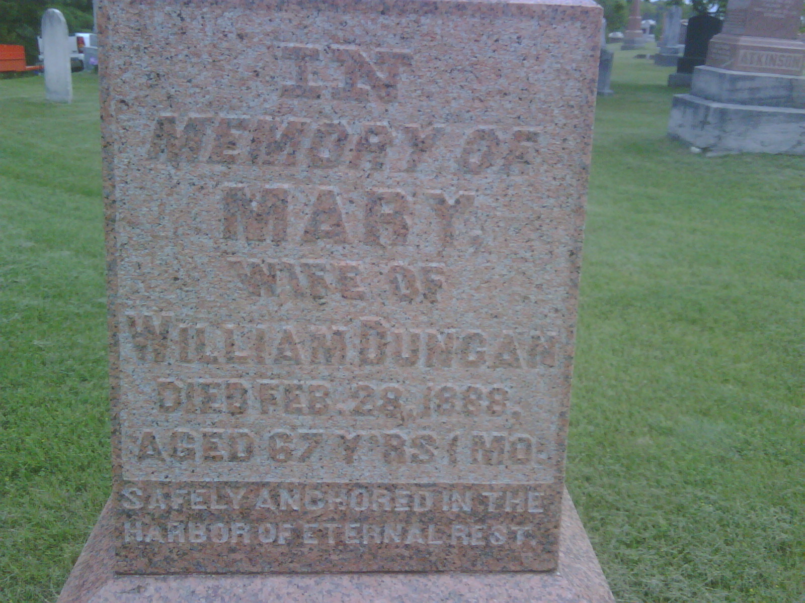 Note: Children: Willis, Henry, Geddes, John, Harriet - per email from Garth Allen, 2017 01 08.2,6 Mary Geddes appeared on the census of 1852 at Cramahe Twp., Northumberland Co., Ontario; Age 29 at 1851 Census: see William Duncan.2 She appeared on the census of April 1871 at Cramahe Twp., Northumberland East Co., Ontario; Age 47 at 1871 Census: see William Duncan.3 She appeared on the census of April 1881 at Cramahe Twp., Northumberland East Co., Ontario; Age 60 at 1881 Census: see William Duncan.5 She died on 28 February 1888 at Cramahe Twp., Northumberland Co., Ontario, at age 67; Date Feb 28 1888 per Memorial. Date Feb 28 1888 per email from Garth Allen, 2017 01 08.4,6 She was buried on 2 March 1888 at Warkworth Cemetery, Warkworth, Northumberland Co., Ontario; Memorial: (See Exhibit) In; Memory of; Mary; Wife of; William Duncan; Died Feb 28, 1888; Aged 67 Y'rs 1 Mo. (Warkworth Cemetery, Warkworth, Jul 7 2009.)4