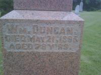 British Army, built on a grant of Crown Land, the family homestead which still stands, the first house south of Morganston, Ontario on the north side of County Road #25. They had been married on May 8, 1840. CHILDREN: Willis, Henry, Geddes, John, Harriet". I would like to find out their history prior to their arrival here. Any suggestions of where to begin would be so appreciated. I hope your Christmas was special and 2017 is a joyous year. Look forward to hearing from you, Dan. Garth" per email from Garth Allen, 2017 01 08 circa 1894 at Toronto, Ontario.1 He died on 21 May 1895 at Cramahe Twp., Northumberland Co., Ontario, at age 77; Date May 21 1895 per Memorial. Date May 23 1895 per email from Garth Allen, 2017 01 08.9,1 He was buried on 23 May 1895 at Warkworth Cemetery, Warkworth, Northumberland Co., Ontario; Memorial: (See Exhibit) Wm. Duncan; Died May 21 1895; Aged 78 Y'rs. (Warkworth Cemetery, Warkworth, Jul 7 2009.)9