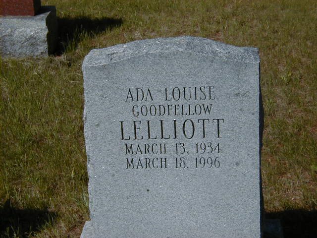 Ada Louise Goodfellow was born on 13 March 1934 at Brighton Twp., Mount Olivet, Northumberland Co., Ontario; from page 51, "Ours To Remember", book by Mary Ann Down, Sep. 3, 2004.1 She Charles Buchanan, a cousin from Colborne, came to the Goodfellow home in 1943 to work as Hired Man after Bill Goodfellow was elected as an MPP. (Dan Buchanan) in August 1943 at Goodfellow Farm, Mount Olivet, Northumberland Co., Ontario.2 As of 19 June 1954,her married name was Lelliott. She married William Thomas "Bill" Lelliott Jr., son of William George Lelliott and Doris Mabel Shelfer, on 19 June 1954 at United Church, Codrington, Northumberland Co., Ontario; "Lelliott-Goodfellow: ... Codrington United Church ... Saturday, June 19, 1954 ... Ada Louise, daughter of Mr. and Mrs. W. A. Goodfellow of Codrington ... William T. Lelliott, son of Mr. and Mrs. William G. Lelliott of Codrington ... Rev. W. Fletcher ... sister Phyllis, Mrs. R. Babcock, Toronto ... Philp, brother ... reside in Toronto ... " Brighton Ensign, June 24, 1954