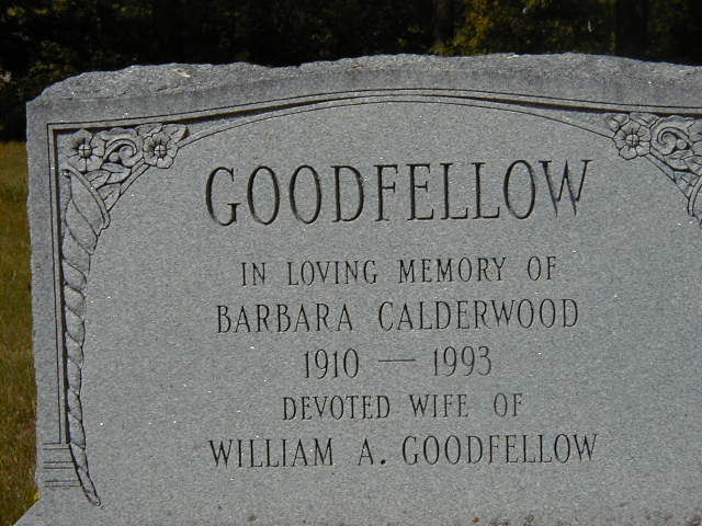 CEMSearch: Name: Barbara Goodfellow; Maiden: Calderwood; Born: 1910; Died - ; Notes: Wife of William A. Goodfellow; Buried: Mount Olivet Cemetery; No other names.3,1