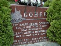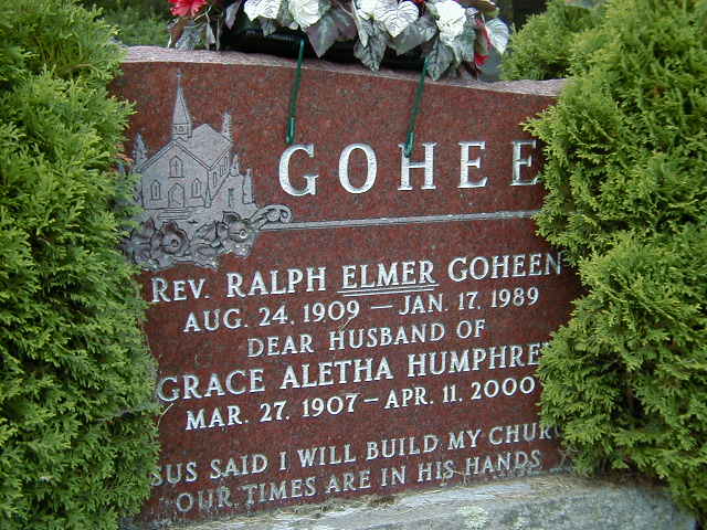 Rev. Ralph Elmer Goheen was born on 24 August 1909 at Ryde Twp., Muskoka Dist., Ontario; Date Aug 24 1909 per Memorial. Per Goug Norman GEDCOM.1 He appeared on the census of 1911 at Ryde Twp., Muskoka Dist., Ontario; Age 1 at 1911 Census: see William Goheen.2 He married Grace Aletha Humphrey circa 1940 at Ontario; per memorial.1 Rev. Ralph Elmer Goheen died on 17 January 1989 at Ontario at age 79; Date Jan 17 1989 per Memorial.1 He was buried on 20 January 1989 at Barkway Cemetery, Ryde Twp., Muskoka Dist., Ontario; Memorial: (See Exhibit) GOHEEN; Rev. Ralph Elmer Goheen; Aug 24 1909 - Jan 17 1989; Dear Husband of; Grace Aletha Humphrey; Mar 27 1907 - Arp 11 2000 (Barkway Cemetery, Ryde Twp., July 16, 2006.)1