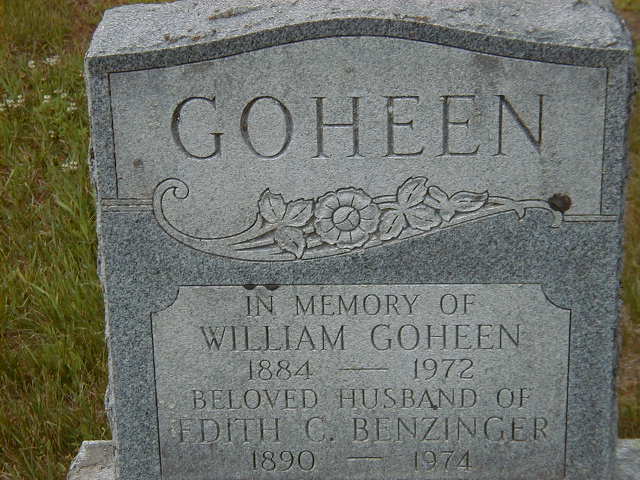 2nd wife - 1st wife died 1912.6,7 William Goheen died on 18 September 1972 at Ontario at age 88; Date Sep 18 1972 per Memorial. Per Goug Norman GEDCOM.8 He was buried on 21 September 1972 at Barkway Cemetery, Rdye Twp., Muskoka Dist., Ontario; Memorial: (See Exhibit) GOHEEN; In Memory of; William Goheen; 1884 - 1972; Beloved Husband of; Edith C. Benzinger; 1890 - 1974 (Barkway Cemetery, Ryde Twp., July 16, 2006.)8