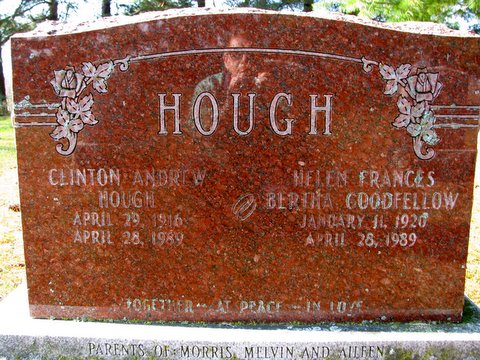 "Predeceased by his sisters, Helen Hough and Dorothy Whiting..." per Death Notice of William Hugh "Bill" Goodfellow.10 She was buried on 2 May 1989 at Mount Olivet Cemetery, Brighton Twp., Northumberland Co., Ontario; Memorial: (See Exhibit) HOUGH; Clinton Andrew; Hough; Apr 29 1916; April 1989; Helen Frances; Bertha Goodfellow; January 11, 1920; April 28, 1989; Parents of Morris, Melvin and Aileen (Mount Olivet Cemetery, Brighton Twp., from Jim Belford, Nov 7 2008)