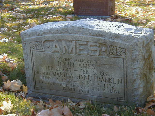 Trenton Courier Advocate, Sep 15 1932: Ames, Martha J. Franklin, died Sept 8 1935 at age 81(Newspaper Index at Trenton Library.)12 She was buried on 11 September 1932 at Prospect Cemetery and Mausoleum, Toronto, Ontario; Memorial: (See Exhibit) Ames; In Loving Memory of; John Ames; feb 2 1849 - Feb 5 1931; His Wife Martha Jane Franklin; June 2 1852 - Sep 8 1932.