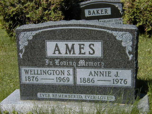 Cemetery Transcription: Ames; In Loving Memory; Wellington S; 1876 - 1969; Annie J; 1886 - 1976 (Lake of the Woods Cemetery, from City of Kenora, sent to me Aug 23, 2002.
