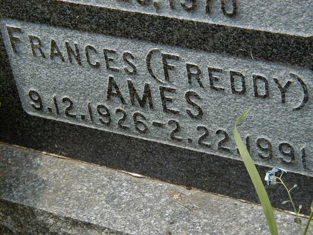 per Valleau GEDCOM. He was buried on 11 August 1963 at New Liskeard Pioneer Cemetery, Dymond Twp., New Liskeard, Temiskaming District, Ontario; Memorial Inscription: Maggie Ames; 1891-1963; Frank Ames; 1882-1963 (Pioneer Cemetery, New Liskeard, July 20, 2001)