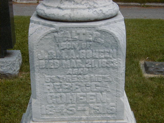 Date 1915 per Memorial. " ... not married ... " Per Alan E. Richards GEDCOM.1,2 She was buried on 17 August 1915 at Port Hope Union Cemetery, Port Hope, Northumberland Co., Ontario; Memorial: (See Exhibit) Walter; Son of; J. & M.A. Goheen; Died Mar. 21, 1893; Aged; 56 Y'rs & 9 mos; Rebecca; Goheen; 1845 - 1915 (Port Hope Union Cemetery, July 23, 2006.)1