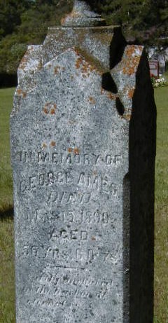 FindaGrave: Name: George Ames; Birth: 15 Nov 1833, Waupoos Island, Prince Edward Co., Ontario, Canada; Death: 15 May 1890 (aged 56), Brighton, Northumberland Co., Ontario, Canada; Burial: Mount Olivet Cemetery, Brighton Twp., Northumberland Co., Ontario, Canada; Memorial ID: 196713324; Note: Father: James (Sr.) AMES b: 1807 in Ontario. Mother: Mary RICHARDSON b: 30 Dec 1810 in Dublin, Ireland. Marriage 1 Catherine Melisa MAYBEE b: 3 Jun 1840 in Sydney Township, Ontario, Canada. Married: 9 Sep 1860 in Brighton Twp., Northumberland Co., Ontario, Canada. Children