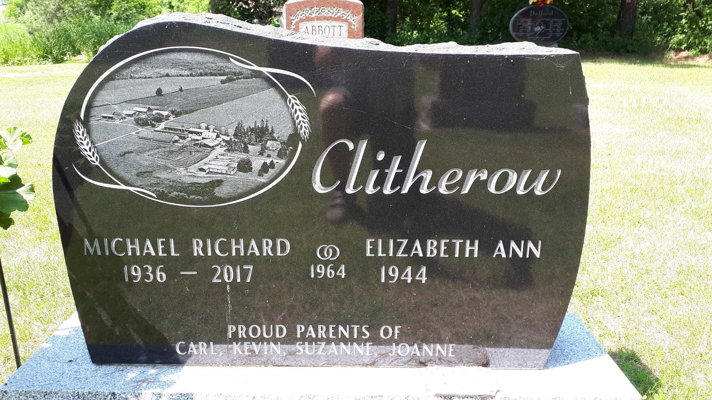 Michael Richard "Mick" Clitherow was born on 1 December 1936 at Saffron Walden, Uttlesford, Essex, England; Birth Index: Name: Clitherow, Michael R; Mother's Maiden Name: Huxley; District: Saffron W; Vol.: 4 a; Page: 1305a (England and Wales Civil Registration Birth Index, 1916-2005, 1936, pg 36 of 79, ancestry.ca) Date 1936 per Memorial. Per Wikipedia, Saffron Walden is in Essex, 43 miles north of London.2,3,1 He "Mike immigrated to Canada in 1957. After settling in at a farm north of Brighton, on the 8th Concessions of Brighton Twp., he began working the dairy farm of Jim & Shirley Bird. A good friend, Howard McCann, soon accepted him into the community as a young farmer and encouraged him to attend KCAT. After graduation in ’61 he returned to the farm to milk cows as well as working at the newly opened Agricultural office, where he worked mostly with Dr. Dick Julian, veterinary, in the lab. In ’65 he and his wife, Betty Ann, were able to purchase the Bird farm which happened to be next door to Betty Ann’s dad’s farm." from hand-written note provided by Betty Ann Clitherow re Rural Roots, Nov 2017. in 1957 at Conc 8, Brighton Twp., Northumberland Co., Ontario.4 He immigrated in 1957 to Brighton Twp., Codrington, Northumberland Co., Ontario; "Mike had determined he was going to farm when he arrived in Canada from England 16 years ago. .. His first two years in Canada were spent working as hired man on a dairy farm near Codrington in Ontario's Northumberland County. In 1959, he enrolled in Kemptville Agricultural College. Mike went to work in the Kemptville laboratories upon graduation in 1961 and was transferred to Brighton. His days were spent in the lab while he worked on the farm evenings and weekends to pay his board." (Tweedsmuir Histories, Reel 1, I-245.)5 He lived in 1962 at Brighton Twp., Codrington, Northumberland Co., Ontario; "Clitherow, Michael, lab. tech, Codrington" Canada Voter Lists, Northumberland County, 1962, pg. 80 of 198, ancestry.ca.2 He lived in 1963 at Brighton Twp., Codrington, Northumberland Co., Ontario; "Clitherow, Michael, lab. tech, Codrington" Canada Voter Lists, Northumberland County, 1963, pg. 84 of 203, ancestry.ca.2 He lived in 1966 at Brighton Twp., Northumberland Co., Ontario; "The 200 acre dairy farm Mike had been working on came up for sale in the spring of 1966. ... Conveniently, the farm was located next door to his father-in-law, Doug Goodfellow." (Tweedsmuir Histories, Reel 1, I-245.)5 He lived on 17 June 1966 at Conc 7 Lot 32, Brighton Twp., Northumberland Co., Ontario; Land Registry Records (Grant 41151) show that James A. Bird & Shirley J. Bird sold the west half of Lot 32, Conc 7, Brighton Twp. to Michael R. Clitherow, Dorothy F. A. Clitherow (Joint Tenants). ITS Date: Jun 17 1966. Reg'n. Date: July 22 1966. (Ontario Land Registry Records, Northumberland Co., Brighton Twp., Conc 7, pg. 203 of 239, Lot 32, pg. 3, page copied from OnLand.ca, Feb 22 2021.)6 He lived on 22 July 1966 at Conc 8 Lot 33, Brighton Twp., Mount Olivet, Northumberland Co., Ontario; Land Records show that James A. Bird & Shirley J. Bird (Joint Tenants) sold 100 acres (E 1/2) to Michael R. Clitherow & Dorothy E. P. Clitherow for $30,000.6 He lived in 1968 at Brighton Twp., Codrington, Northumberland Co., Ontario; "Clitherow, Michael, farmer, Codrington" & "Clitherow, Mrs. Elizabeth Ann, Codrington" Canada Voter Lists, Northumberland County, 1968, pg. 456 of 652, ancestry.ca.2 He "1973 - Speaker at various Soil & Crops day - Kemptville" from hand-written note provided by Betty Ann Clitherow re Rural Roots, Nov 2017. in 1973 at Kemptville, Ontario. He "1977 - Elected to Ontario Soil & Crop Association" from hand-written note provided by Betty Ann Clitherow re Rural Roots, Nov 2017. in 1977 at Northumberland Co., Ontario. He "Probably started to no-till 1988-99. Even convinced his father-in-law, at 65 years of age, you didn’t have plough and cultivate! The sons liked this idea and continue to farm this way." from hand-written note provided by Betty Ann Clitherow re Rural Roots, Nov 2017. in 1988 at Conc 8, Brighton Twp., Northumberland Co., Ontario. He lived on 1 May 2007 at Conc 8 Lot 34, Brighton Twp., Northumberland Co., Ontario; Land Registry Records (Transfer 383725) show that Douglas Cecil Goodfellow transferred the east half of Lot 34, Con 8, Brighton Twp. to Douglas Cecil Goodfellow as to a life interest, Dorothy Elizabeth Ann Clitherow, Michael Richard Clitherow, Carl Richard Clitherow, Kevin Robert Clitherow - partnership as JT to the remainder in Fee. ITS Date: May 1 2007; (Ontario Land Registry Records, Northumberland Co., Brighton Twp., Conc 8, pg. 175 of 192, Lot 34, pg. 4, page copied from OnLand.ca, Feb 22 2021.)6 He lived on 1 May 2007 at Conc 8 Lot 33, Brighton Twp., Northumberland Co., Ontario; Land Registry Records (Transfer 383725) show that Douglas Cecil Goodfellow transferred the west half of Lot 33, Con 8, Brighton Twp. to Douglas Cecil Goodfellow as to a life interest, Dorothy Elizabeth Ann Clitherow, Michael Richard Clitherow, Carl Richard Clitherow, Kevin Robert Clitherow - partnership as JT to the remainder in Fee. ITS Date: May 1 2007; (Ontario Land Registry Records, Northumberland Co., Brighton Twp., Conc 8, pg. 171 of 192, Lot 33, pg. 5, page copied from OnLand.ca, Feb 22 2021.)6 He died on 23 July 2017 at Kingston General Hospital, Kingston, Frontenac Co., Ontario, at age 80; Date 2017 per Memorial. "CLITHEROW, Michael "Mick" (Proud Canadian Farmer) ... it is with great sadness that we announce the passing of Mick at the Kingston General Hospital on Sunday, July 23rd, 2017, in his 81st year. Beloved husband of Betty Ann Clitherow (nee Goodfellow) for 53 years of marriage together. Proud father, forever loved by his children Carl (Christine), Kevin (Cindy), Suzanne Patrick (Curtis), and Joanne Campbell (Ryan). Loving and proud grandfather of Lindsay, Jenna (Luke), Molly, Lucy, Caroline, Michael, Grace, Abby, Charlotte, and Vaughn. Su