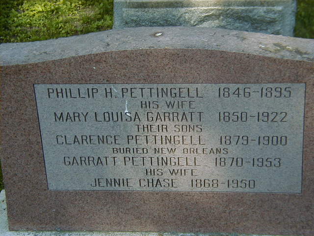 IGI Record.7 Garratt Pettingill lived on 20 April 1901 at Michel Creek Co. Land, Kootenay East, British Columbia; Residence per 1901 Census: "Michel Creek Co. Land", Kootenay East, South Riding, Yale & Caribou, British Columbia.5 He appeared on the census of 20 April 1901 at South Riding, Kootenay East, Yale & Caribou, British Columbia; Age 30 at 1901 Census: Pettingell, Garratt, 30, b. Ont. r. Aug 31 1870, Ger., Meth., Coal Miner, married; Jennie, 32, b. Ont. r. Nov 15 1868, Eng., Meth., married; Gladys, - , b. Ont. r. July 13 1900, Ger., Meth., daughter (1901 Census Online: Kootenay East, South Riding, Yale & Caribou, British Columbia, dist. 5, sub-dist. e-7, pg. 16, line 16, T-6430 - Michel Creek Co. Land.)5 He died in 1953 at Wellington, Prince Edward Co., Ontario; Date 1953 per Memorial. Per Post-it on my GEDCOM byt Carol McNerney, Nov 6, 2001.3 He was buried in 1953 at Wellington Cemetery, Wellington, Prince Edward Co., Ontario; Memorial: (See Exhibit) Phillip H. Pettingill 1846 - 1895; His Wife; Mary Louisa Garratt 1850 - 1922; Their Sons; Clarence Pettingill 1879 - 1900; Buried New Orleans; Garratt Pettingill 1870 - 1953; His Wife; Jennie Chase 1868 - 1950 (Wellington Cemetery, Wellington, May 28, 2006) Per Post-it on my GEDCOM byt Carol McNerney, Nov 6, 2001.3