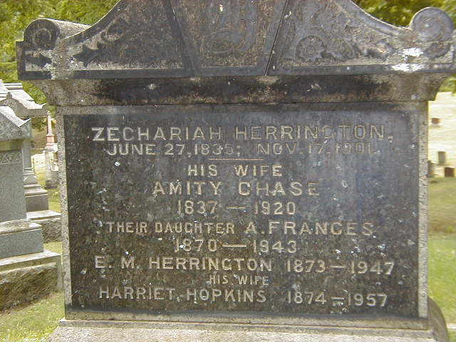 Memorial Transcription: Zachariah Herrington; June 27 1835; Nov 17 1901; Wife; Amity Chase; 1837-1920; Daughter A. Frances; 1870-1943; E. M. Herrington; 1873-1947; Wife; Harriet Hopkins (Glenwood Cemetery, Picton)