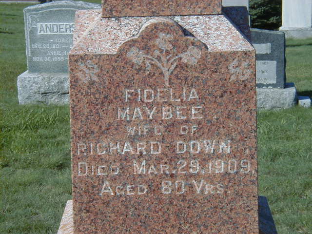 "In 1844 he married Fidila Maybee of Murray Township." from Pleasant Valey - Down History.4 Fidelia Maybee appeared on the census of 1851 at Brighton Twp., Northumberland Co., Canada West; Age 24 at 1851 Census: see Richard Down.2 She appeared on the census of April 1861 at Brighton Twp., Northumberland Co., Ontario; Age 33 at 1861 Census: see Richard H. Down.1 She appeared on the census of April 1871 at Brighton Twp., Northumberland Co., Ontario; Age 44 at 1871 Census: see Richard Down.5 She appeared on the census of April 1881 at Brighton Twp., Northumberland Co., Ontario; Age 51 at 1881 Census: see Richard Down.6 She appeared on the census of April 1901 at Brighton Twp., Northumberland Co., Ontario; Age 72 at 1901 Census: see William Down (son.)3 She died on 29 March 1909 at Ontario at age 80; Date Mar 29 1909 per Memorial.7 She was buried on 2 April 1909 at McPhail's Cemetery, Brighton Twp., Northumberland Co., Ontario; Memorial: (See Exhbit) Fidelia; Maybee; Wife of; Richard Down;