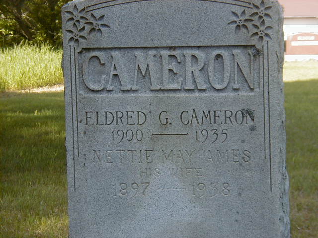 "Eldred and Nettie Ames Cameron both died at an early age leaving their 3 sons who were then raised by their grandparents." from Tweedsmuir Histories of Codrington.1 She was buried in 1938 at Mount Olivet Cemetery, Brighton Twp., Ontario; Memorial: (See Exhibit) CAMERON; Eldred G. Cameron; 1900 - 1935; Nettie May Ames; His Wife; 1897 - 1938 (Mount Olivet Cemetery, Brighton Twp.)1