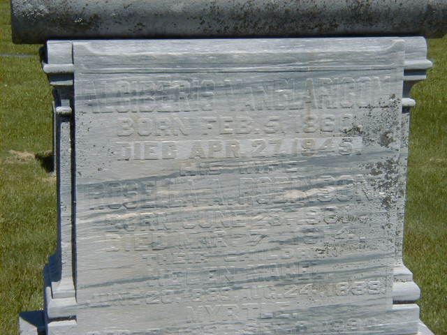 Note: Lawrence???? Should be Florence???3 He lived on 7 March 1914 at Brighton Twp., Codrington, Northumberland Co., Ontario; Informant for Death Reg'n. of his wife, Rosella Robinson.5 He lived on 1 May 1922 at Conc 8 Lor 3, Brighton Twp., Codrington, Lot 5, Northumberland Co., Ontario; Land Registry Records (Grant 10752) show that George F. Sequire sold Codrington Village Lot 5, East of Richards St., to Alciberis Van Blaricom. ITS Date May 1 1922.11 He lived on 31 January 1929 at Conc 8 Lot 3, Brighton Twp., Codrington, Northumberland Co., Ontario; Land Registry Records (Grant 12509) show that Alciberis Van Blaricom sold part of the center part of the North 12 acres of Lot 3, Conc. 8 to Robert Barrett Ryckman, Alciberis Van Blaricom, John Kemp, Maurice Ames, John Dinner, Grant Goodfellow, William Goodfellow, James Henry Ross, Harry Reddom, Kenneth Gladstone Ames, Harper Peister, Trustees of Codrington Congregation of the Untied Church of Canada. ITS Date Jan 31 1929. Reg'd. Date Sep 25 1936.11 He Alciberus "Al" Van Blaricom appears in The Latimer Photos which were taken by Hugh Latimer during the early 1920s and late 1930s at his father's General Store in Orland. (The Latimer Photos, Codrington Public Library) circa 1930 at Brighton Twp., Orland, Northumberland Co., Ontario.12 He lived on 7 June 1930 at Conc 8 Lot 3, Brighton Twp., Codrington, Lot 6, Northumberland Co., Ontario; Land Registry Records (Grant 11875) show that Alciberis Van Blaricom (unmarried) sold part of Codrington Village Lot 6, Block B, West of Richards St. to Robert B. Ryckman. ITS Date Jun 7 1930.11 He died on 27 April 1945 at Brighton Twp., Northumberland Co., Ontario, at age 85; Date Apr 27 1945 per Memorial & CEMSearch. Transactions re his Estate (Will) appear in the Land Registry Records for Codrington Village Lot 5 in1946.11,13 He was buried on 29 April 1945 at McPhail's Cemetery, Brighton Twp., Northumberland Co., Ontario; Memorial: (See Exhibit) Alciberis VanBlaricom; Born Feb. 5, 1860; Died Apr. 27, 1945; His Wife; Rosella A. Robinson; Born: June 28, 1861; Died March 7, 1914; Their Children; Helen Mabel; June 20, 1889 - Aug. 24, 1889; Myrtle; Sep. 4, 1890 - Sep. 8, 1890 (McPhail's Cemetery, Brighton Twp.)