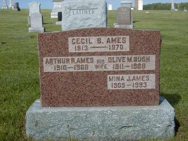 CEMSearch shows: Arthur Ames, Born: 1910, Died: 1988, McPhail's Cemetery (conc 5 Lot 30, Brighton Twsp.) Other names: Cecil B. Ames, Ida Gainforth, Olive M. Bush, William R. Ames.1,4
