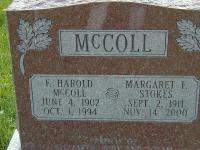 Francis "Harold" McColl was born on 4 June 1902 at Conc 9 Lot 6, Brighton Twp., Codrington, Northumberland Co., Ontario; Birth Reg'n.##028276: Name: Francis Harold McColl; Date: Jun 4 1902; Parents: Samuel McColl & Ethel Maud Ames; Occ.: farming, Lot 6, Conc 9; Phys.: N. D. Richards; Inf.: Samuel McColl; Reg'd.: Jun 20 1902 (Ontario Birth Registration, #028276-1902, ancestry.ca) Date June 4, 1902 per Burial. Date Jun 1903 per 1911 Census.1,2,3 He appeared on the census of June 1911 at Brighton Twp., Hilton, Northumberland Co., Ontario; Age 8 at 1911 Census; see Samuel McColl.2 He lived on 14 July 1934 at Toronto, York Co., Ontario; Witness at marriage of George Edwin Sprung & Jean Adair McColl.4 He married Margaret Frances Stokes on 24 October 1936 at Niagara Falls, Ontario. Francis "Harold" McColl lived in 1957 at Iona Ave., Ottawa, Carleton Co., Ontario; "180 McColl, Francis Harold, electrical engineer ... 92" & 180 McColl, Mrs. Margaret .... 93" Canada Voter Lists, 1957, Carleton Co., City of Ottawa, pg. 259 of 443, ancestry.ca.5 He died on 1 October 1994 at Brighton, Northumberland Co., Ontario, at age 92; Date Oct 1 1994 per Burial.1 He was buried on 4 October 1994 at McPhail's Cemetery, Brighton Twp., Northumberland Co., Ontario; Memorial: (See Exhibit) McColl; F. Harold; McColl; June 4, 1902; Oct. 1, 1994; Margaret F; Stokes; Sept. 2, 1911; Nov. 14, 2000 (McPhail's Cemetery, June 4, 2005.)1