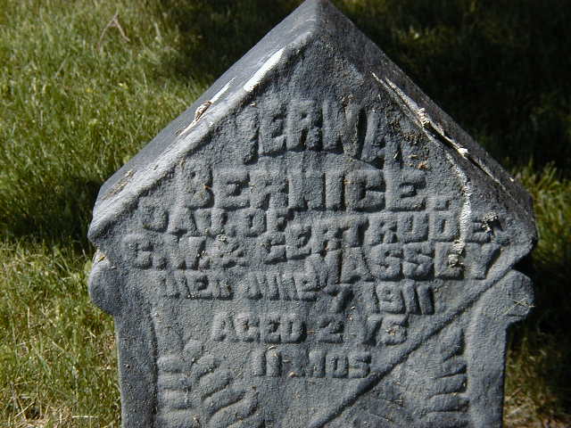 CEMSearch: Name: Verna Bernice Massey; Born: 1908; Died: 1911-06-07; Age: 2y 11m; Notes: Daughter of C. W. and Gertrude Massey, died of scarlet fever (Massey History); Buried: Stone's Cemetery, Percy Twp; No other names.