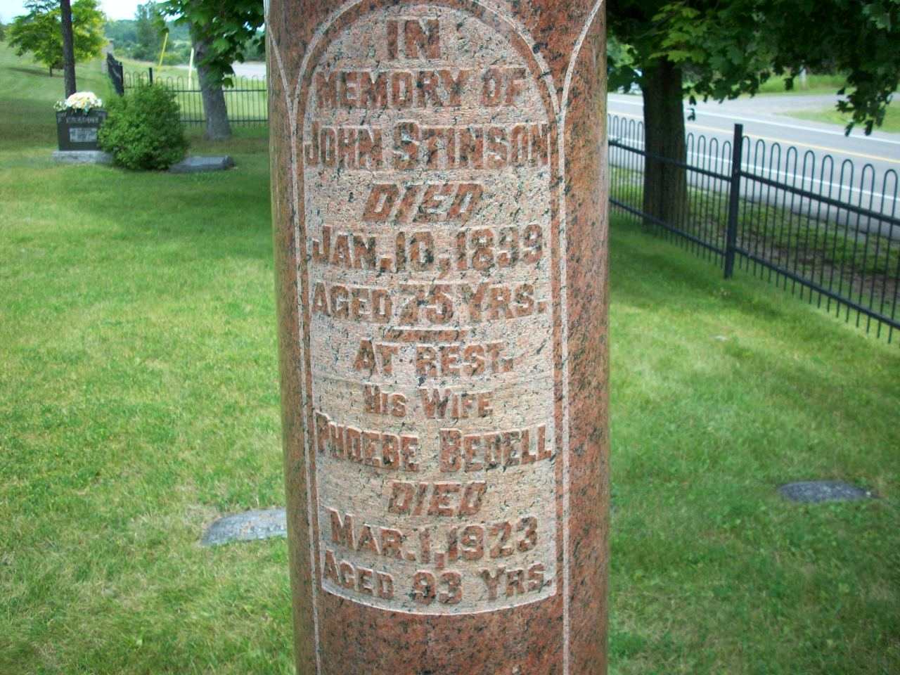 John Smith Stinson was born on 18 August 1823 at Hallowell Twp., Prince Edward Co., Upper Canada; Date 1823 per Memorial. Date 1825 & location UC per 1861 Census. Date Aug 18 1823 per Doug Norman's GEDCOM. per marriage reg'n. of son Albert Washington Stinson.4,1,2,3 He married Pheobe Bedell circa 1846 at Canada West; per marriage reg'n. of son Albert Washington Stinson.1 John Smith Stinson appeared on the census of April 1861 at Percy Twp., Northumberland Co., Canada West; Age 36 at 1861 Census: Stinson, John, 36, b. UC, CE, farmer, married; Phebe, 32, b. UC, CE, married; Mary, 14; James, 12; Edmond, 6; Albert, 4; David, 1 (1861 Census: Percy Twp., Northumberland Co., pg. 80 of 899, line 1 - ancestry.ca)