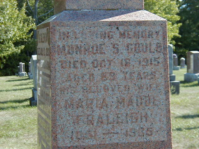 CEMSearch: Name: Monroe S. Gould; Born: 1846; Died: 1915-10-16; Notes: H/O Maud Marie Fraleigh; Buried: Salem Cemetery, NW; Other names: Adam B. Gould (1880-1940), Charles Orloff Gould ( -1877), Clara Farrow (Gould) (1873-1943), Deborah A. Gould, Edward Farrow (1869-1959), Maud Marie Gould (Fraleigh) (1851-1935), R. Olevia Gould ( -1892.)8,9,10