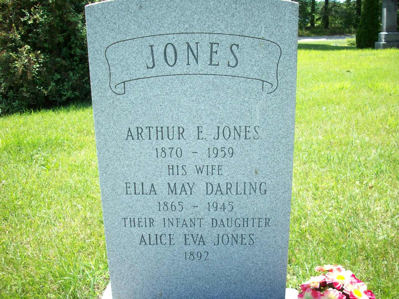 Arthur Edward Jones was born on 22 February 1870 at Cramahe Twp., Northumberland Co., Ontario; Date 1870 per Memorial. Date Feb 1870 & location Ont. per 1911 Census. Date 1870 & location Ont. per 1881 Census. Date 1870 & location Ont. per 1871 Census. Date FEb 22 1870 & location Durham Co. per family tree of JefferyDodds on ancestry.com, June 26 2012. History of Cramahe Twp., pg. 84.1,4,5,6,2 He appeared on the census of April 1871 at Cramahe Twp., Northumberland Co., Ontario; Age 1 at 1870 Census: see Joseph Jones.4 He appeared on the census of April 1881 at Cramahe Twp., Northumberland Co., Ontario; Age 11 at 1881 Census: see Joseph Jones.5 He married Ella May Darling, daughter of John Henry Darling and Susannah White, on 22 October 1890 at Castleton, Northumberland Co., Ontario; per family tree of JefferyDodds on ancestry.com, June 26 2012.2 Arthur Edward Jones appeared on the census of 1911 at Cramahe Twp., Northumberland Co., Ontario; Age 41 at 1911 Census: Jones, Arthur E., 41, b. Ont. Feb 1870, Eng., Meth., farmer, married; May, 45, b. Ont. Jul 1866, Eng., Meth., married; Clare, 16, b. Ont. Sep 1895, daughter (1911 Census Online: Cramahe Twp., dist. 101, sub-dist. 10, pg. 9, line 21 - Conc 7, Lot 24?)1 He lived in 1911 at Conc 7 Lot 24, Cramahe Twp., Northumberland Co., Ontario; Residence per 1911 Census: Conc 7, Lot 24?, Cramahe Twp.1 He was buried in 1959 at Castelton Cemetery, Castleton, Northumberland Co., Ontario; Memorial: (See Exhibit) Jones; Arthur E. Jones; 1870 - 1959; His Wife; Ella May Darling; 1865 - 1945; Their Infacnt Daughter; Alice Eva Jones; 1892 (Castleton Cemetery, Castleton, Jul 13 2009.)6 He died in 1959 at Ontario; Date 1959 per Memorial.6