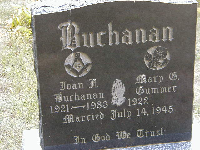 CEMSearch: Name: Ivan A. Buchanan; Born: 1921; Died: 1983; Notes: Married Mary G. Gummer July 14 1945; Buried: Salem Cemetery, Sec SW; Other names: Mary G. Buchanan (Gummer) (1922-.1,3 ) He died in 1983 at Ontario; Date 1983 per CEMSearch Record.1